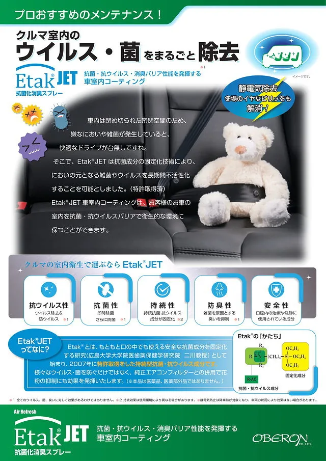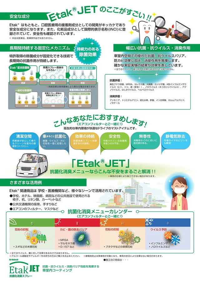 【Etak JET】は広島大学大学院医歯薬保健学研究院で研究され、口の中でも使える安全な抗菌成分を固定化する研究として始まり、2007年に特許取得をした持続型抗菌・抗ウイルス成分です。